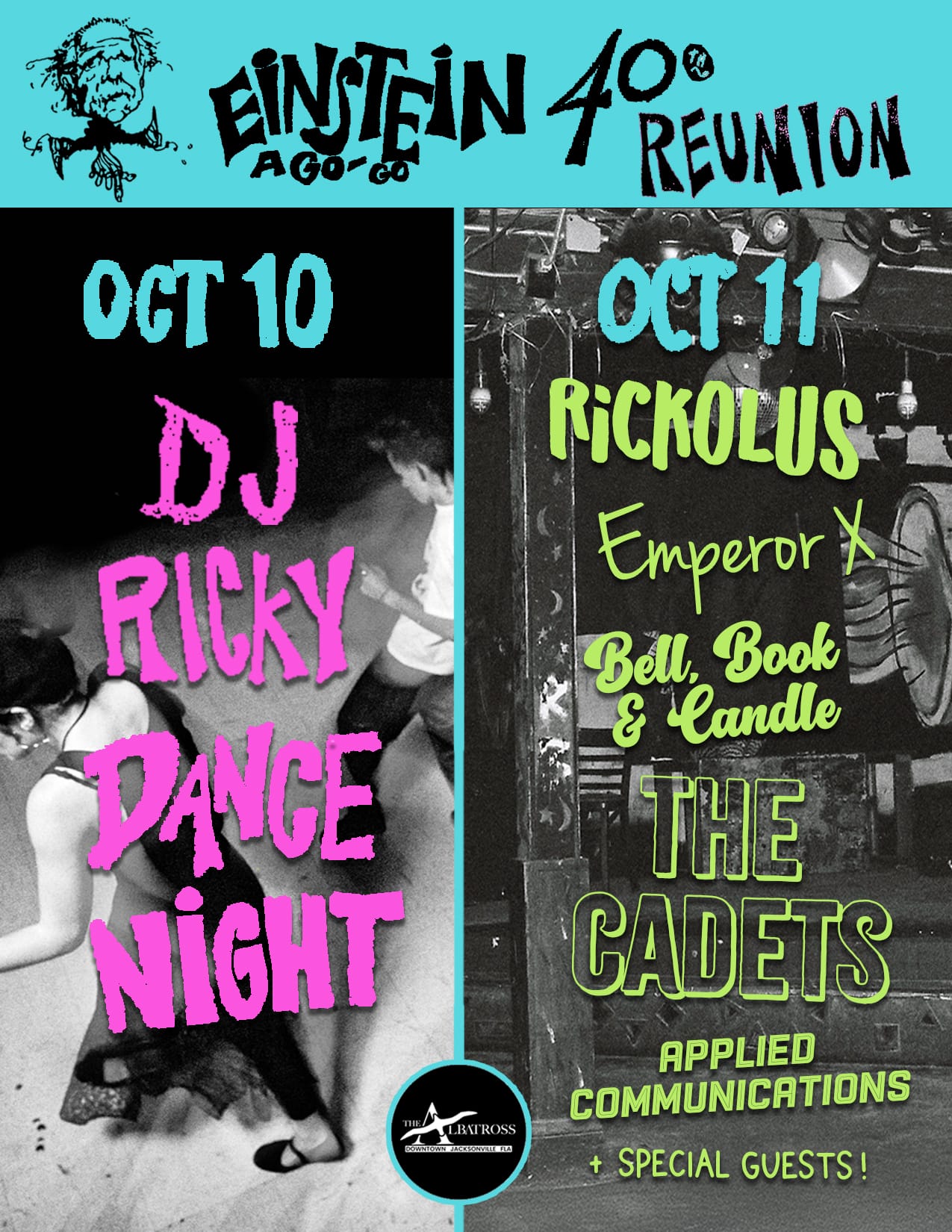 - Saturday's Reunion Concert features an incredible bill of RickoLus, Bell, Book & Candle, The Cadets, Applied Communications and Emperor X. We're expecting several special guests who played the club between 1985 and 1997 to join in throughout the night to play some of their favorite songs from the Einstein's era. And of course, Tammie has a few surprises in store for us.