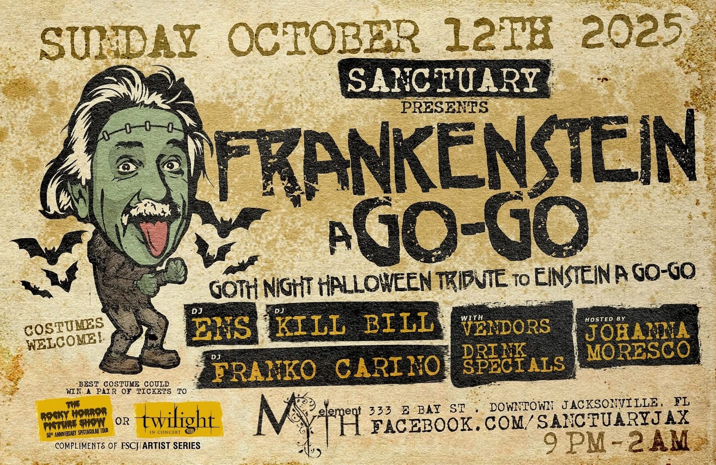 On Oct. 12, the Frankenstein A Go-Go, a Halloween-themed tribute to Einstein’s, takes place at Sanctuary’s monthly goth night at Myth Nightclub, 333 East Bay St., Jacksonville, FL 32202